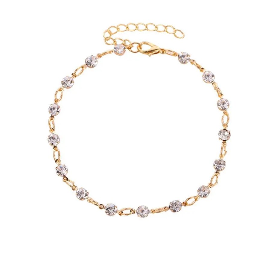 The anklet features a delicate chain made from high-quality, lustrous gold, which gracefully wraps around your ankle, creating a captivating and alluring look. Adorned with enchanting crystal stones, each carefully selected for their shimmering brilliance, this anklet sparkles and catches the light with every step you take.