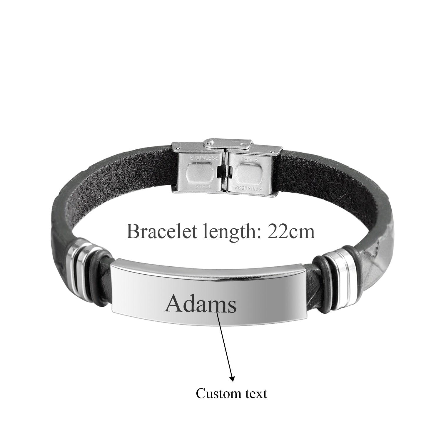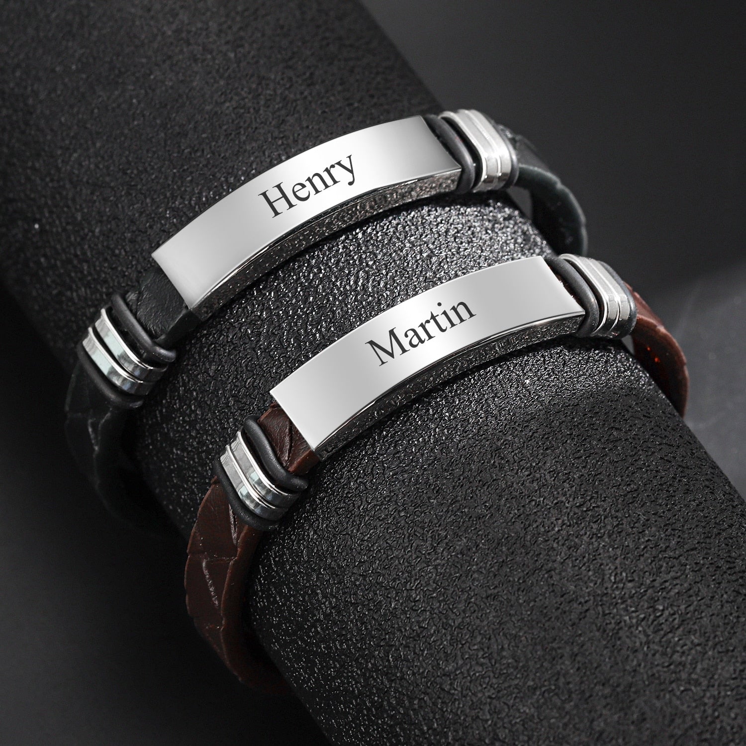 Are you looking for a perfect gift for a man ? Our personalized bracelet can be engraved with names or words of your choice to create a unique gift. It features layered leather bands connected to a stainless steel engraving plate which looks stylish and unique . This is a perfect gift for Father’s Day or husband’s birthday or special event or to commemorate a family member or friend. Create your one of a kind gift today with our custom layered leather bracelet .