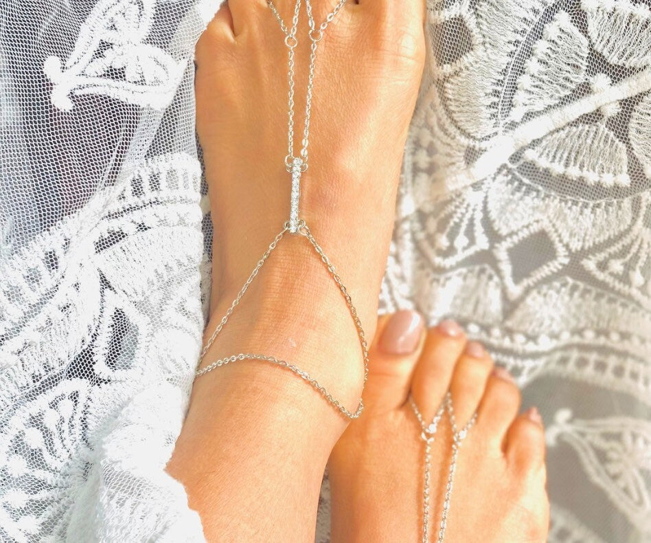 These are elegant and beautiful bare foot sandals and glam up your feet with the touch of tiny rhinestones with two toe chains. These silver barefoot sandals are perfect to pair with a gown for a beach wedding or barefoot adventure.